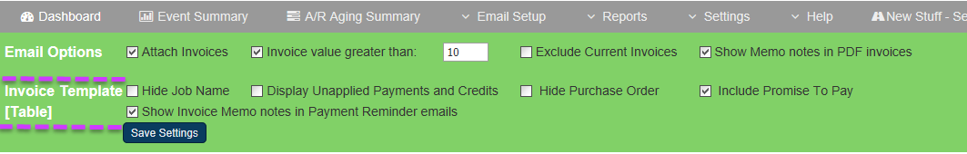 Invoice Memo Notes in the payment reminders email table.